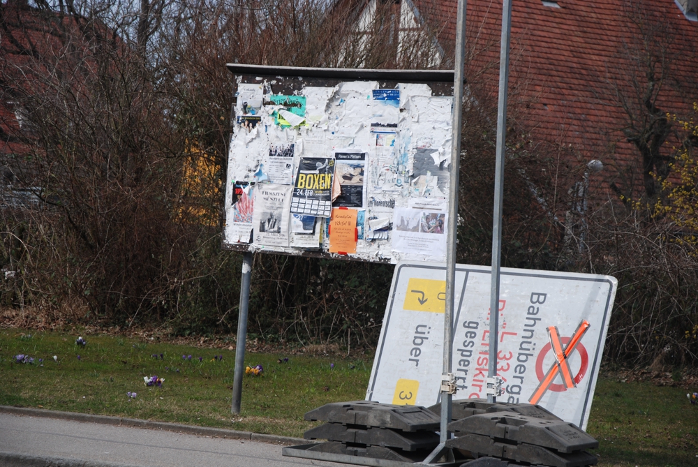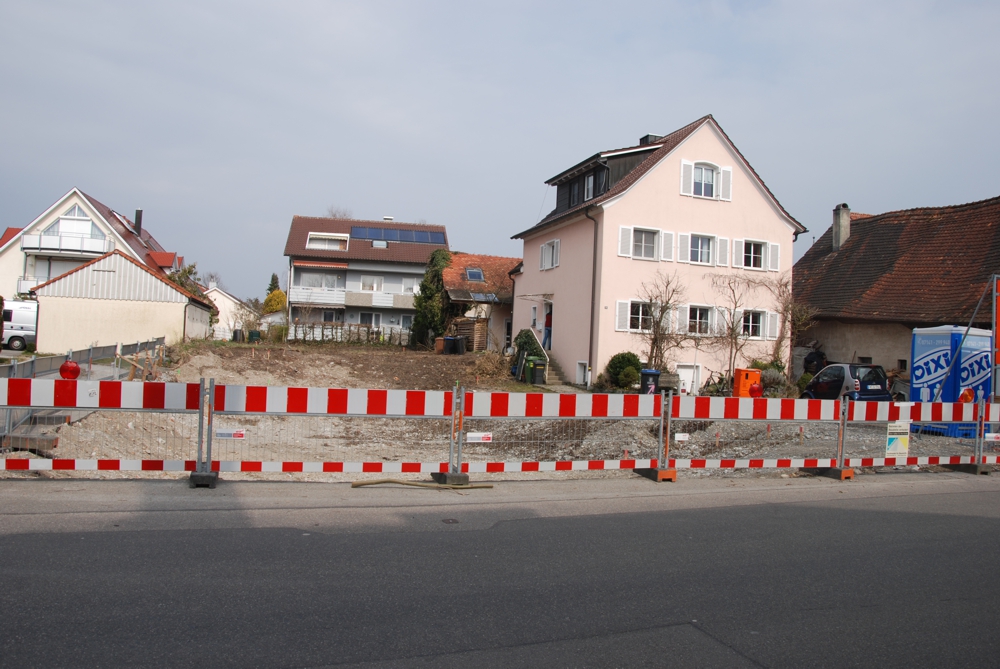In mehr als 20 m Entfernung von der Baustelle sieht man in einem Schaukasten einen roter Punkt mit den eigenartigen Text: