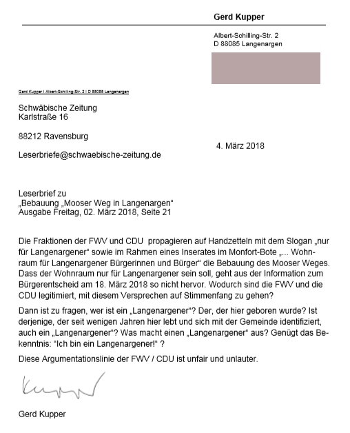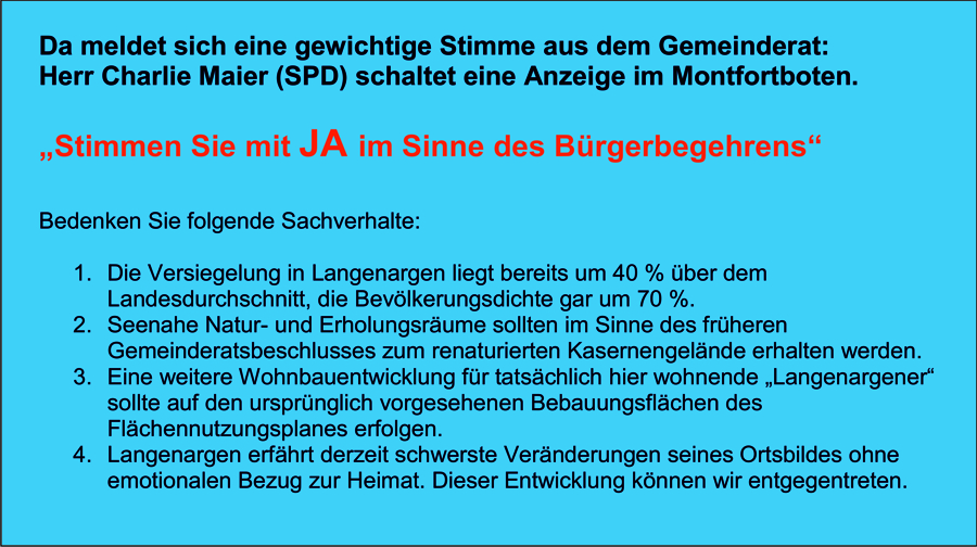 Der Blick auf das vergangene Jahr in der Gemeinde Langenargen ist geprägt von Sprachlosigkeit der Verwaltung mit der Bürgerschaft. So konnte man gerade in der Zeit nach dem Bürgerentscheid immer wieder feststellen, wie tief verletzt gerade die Verwaltungsspitze und Teile des Gemeinderates durch das Votum gegen die Bebauung des Mooser Wegs waren. Dieses Votum war neben den sachlichen Argumenten eine Abstimmung gegen den willkürlichen Umgang mit dem Empfinden der Bürgerschaft. Diese hat auch abgestimmt gegen die Missachtung des Willens des Gemeinderates aus der Vergangenheit, ja man kann dieses Abstimmungsverhalten auch als Zeichen eines noch gesunden demokratischen Menschenverstandes in einer mündigen Bürgerschaft bezeichnen.
