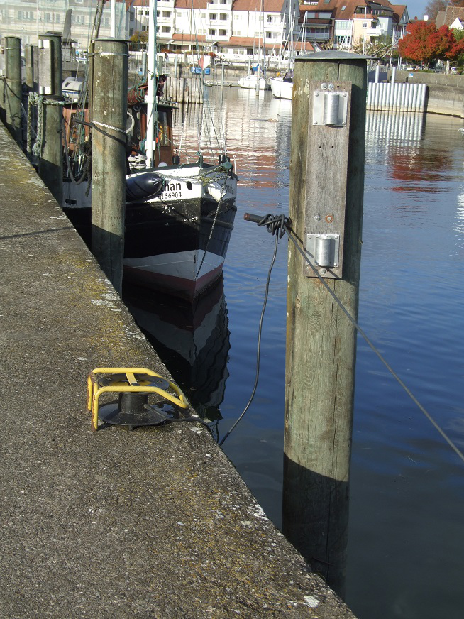 Festmacher auf dem Steg. Auf dem rechten unten Bild, der große Dalben ist ca. 80 Jahre alt, die neuen Dalben sind