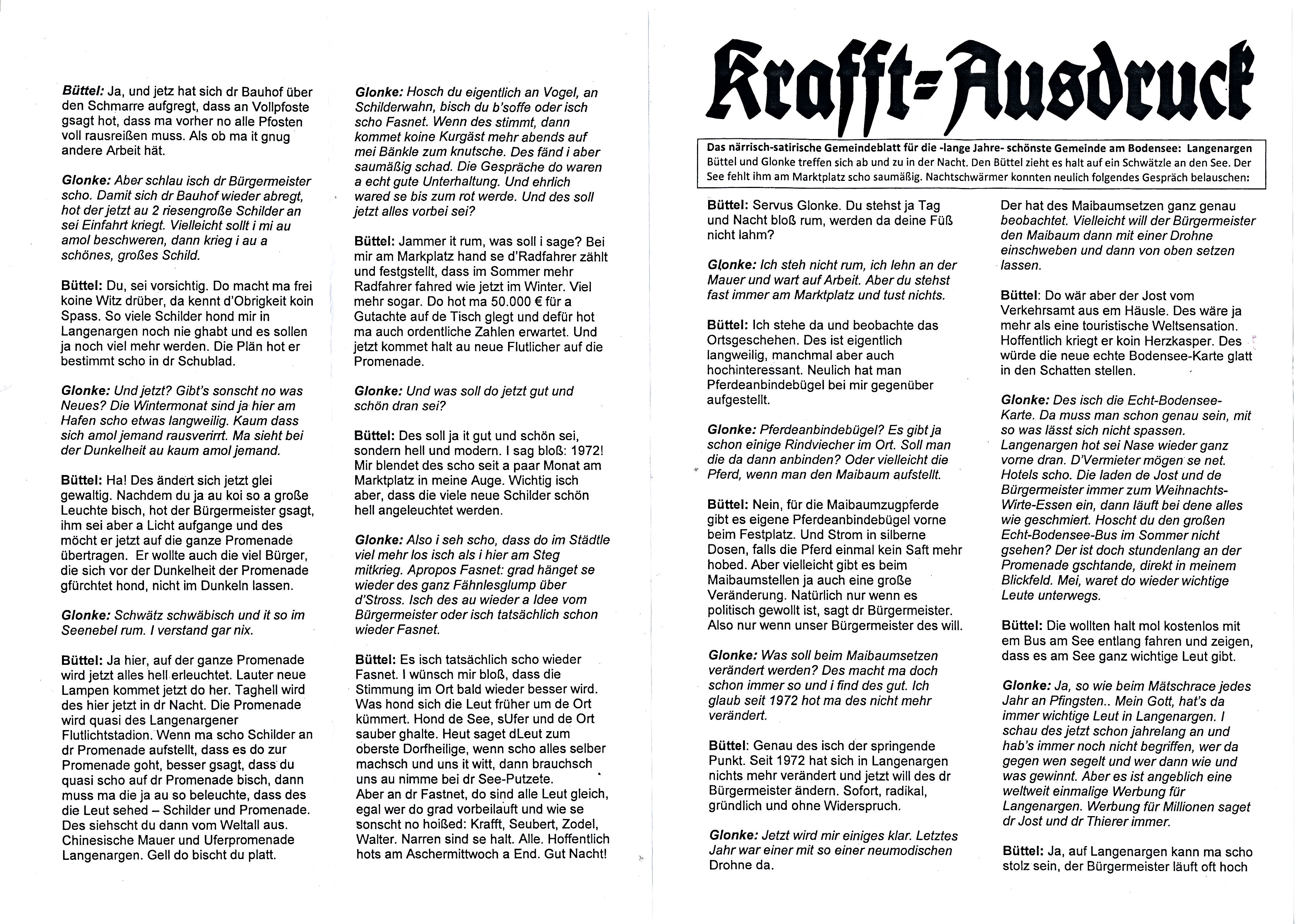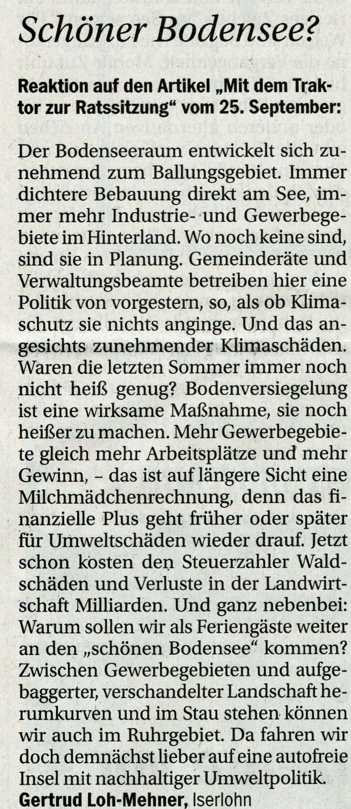 In vielen Gemeinden des Bodenseekreises, wie auch der Städte Überlingen, Meersburg sowie Friedrichshafen gibt es eine Vielzahl von engagierten Menschen, die, wie das Netzwerk für Friedrichshafen oder die Offene Grüne Liste in Langenargen, ökologische, wirtschaftliche und demokratische Entwicklungen deutlich voranbringen können und wollen. Das sollten die Teilnehmer des Gastro- und Handelsinteressensverbandes begreifen, oder auch als Ratgeber das Grundgesetz zu Rate ziehen.