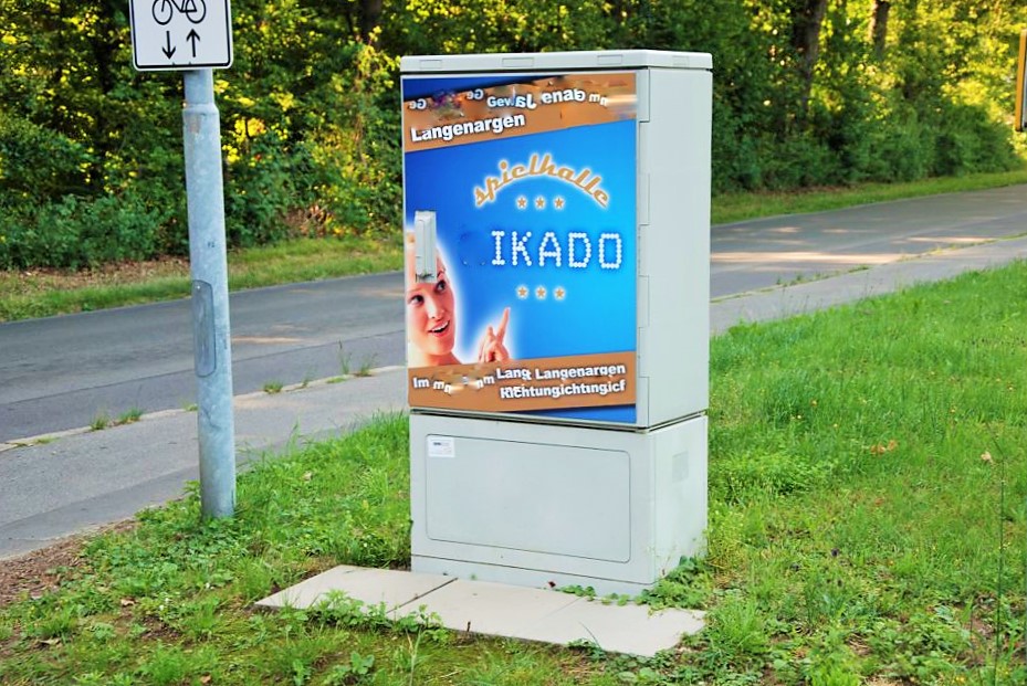 ist der Stromkasten mit Werbung für eine Spielhalle im Gewerbegebiet mit dem Namen Mikado versehen.