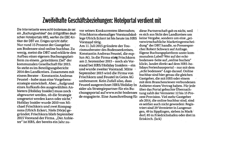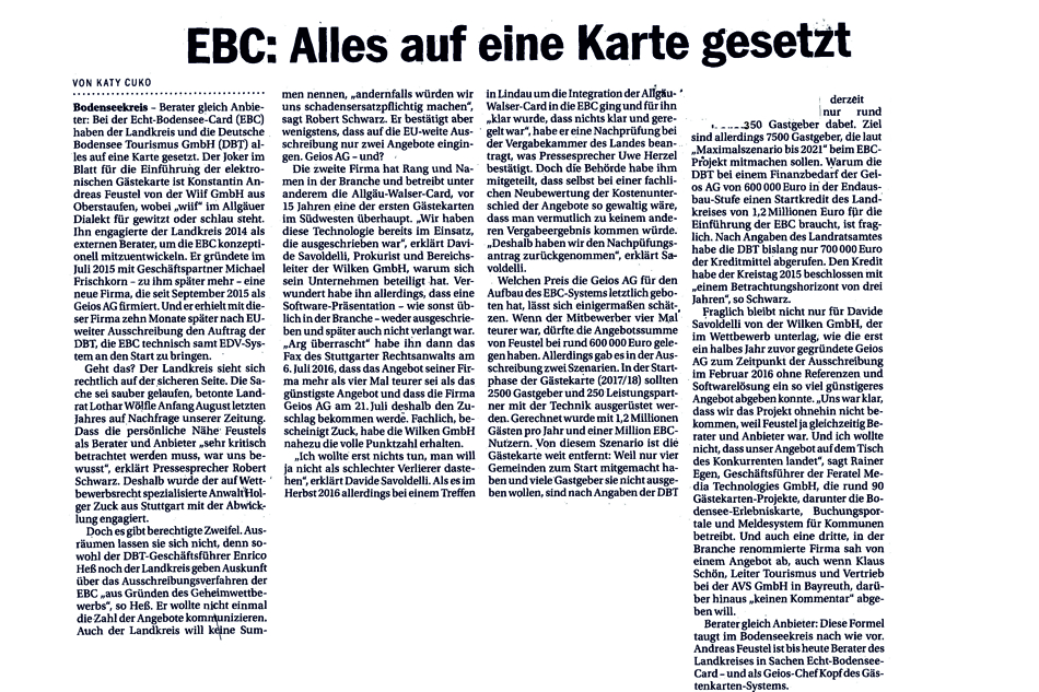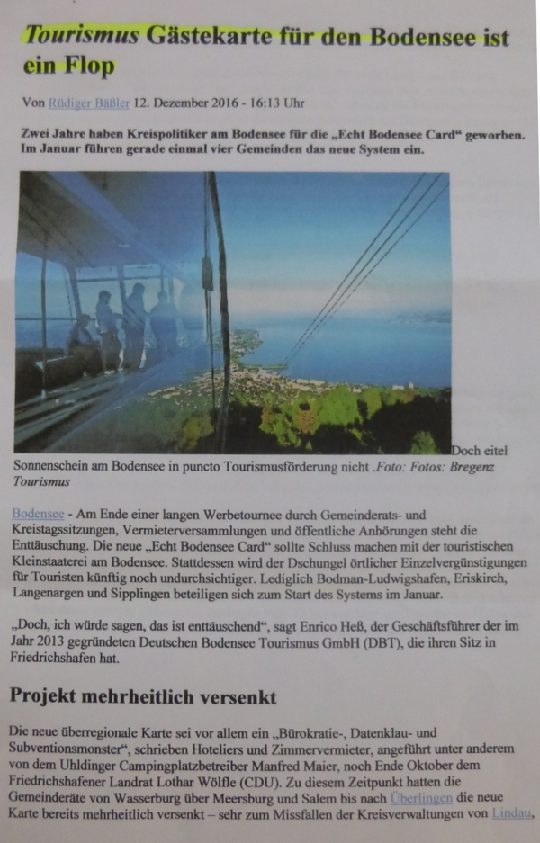 * Die Gründung der Deutsche Bodensee Tourismus GmbH erfolgte bereits im März 2013. Es dauerte allein bis zur Einführung der Echt Bodensee Card, bedingt durch den heftigen und dauerhaften Widerstand hunderter Gastgeber im Bodenseekreis bis 2017. Immer noch weigern sich viele Gemeinden der DBT auf die ausgelegte Leimrute zu kriechen.