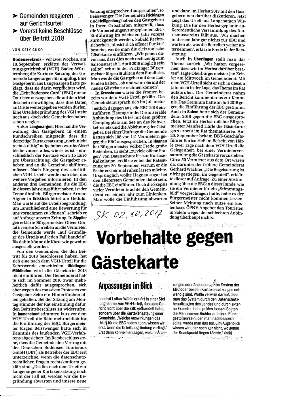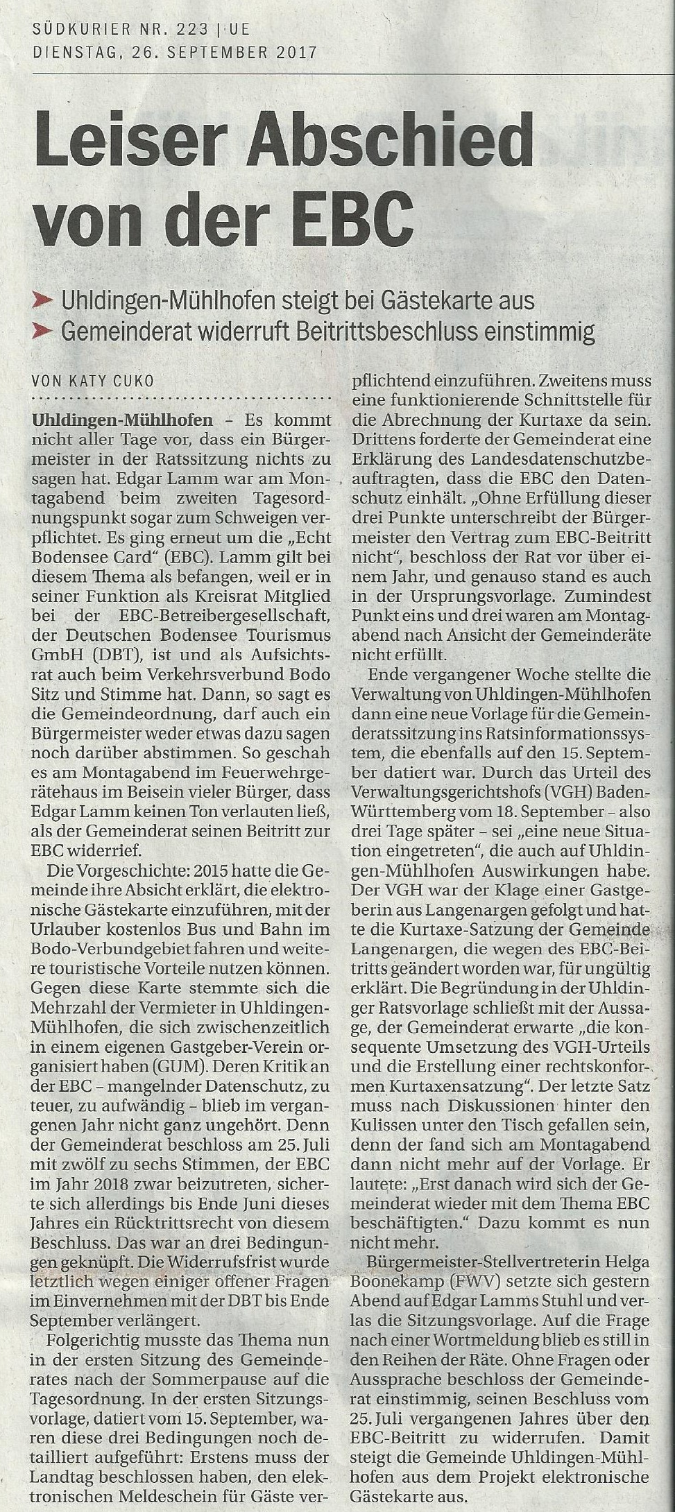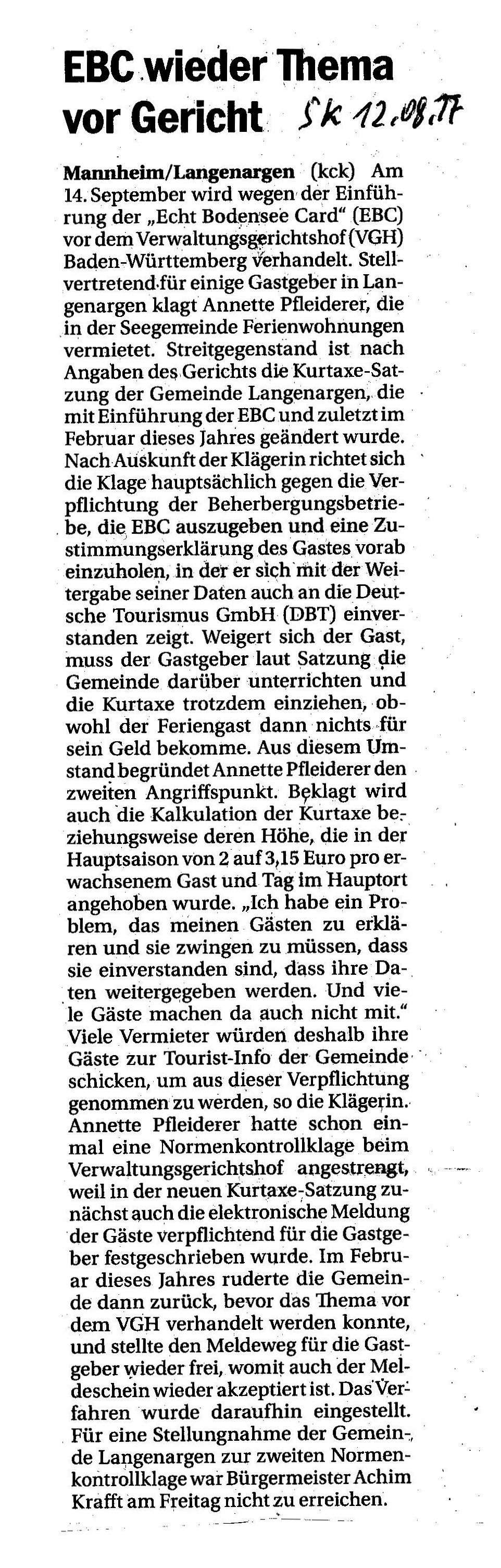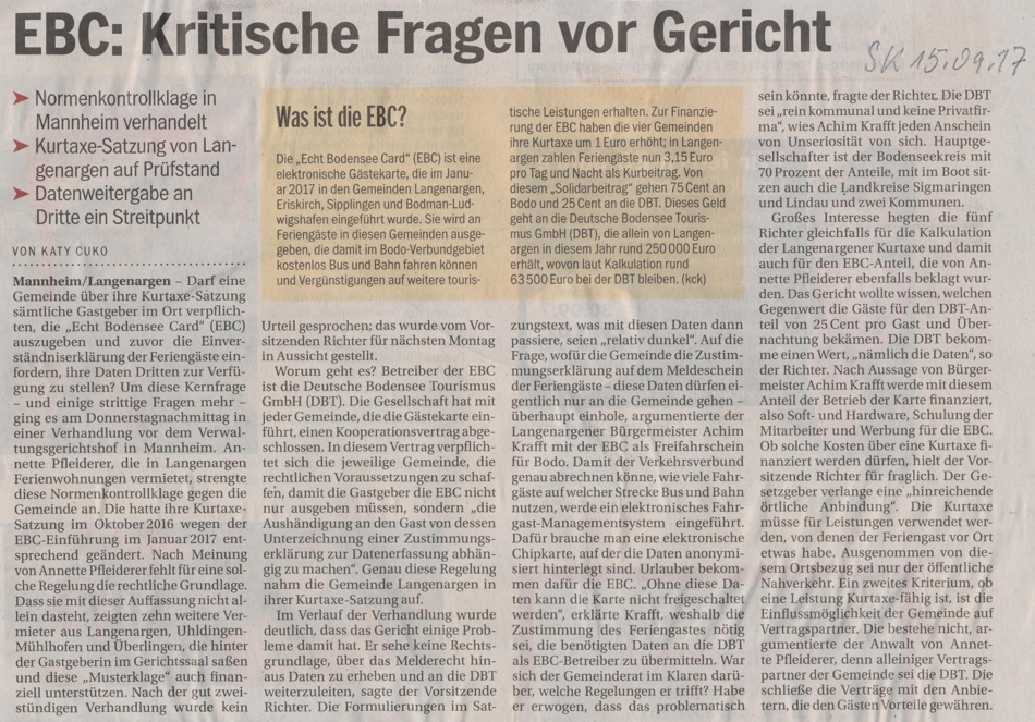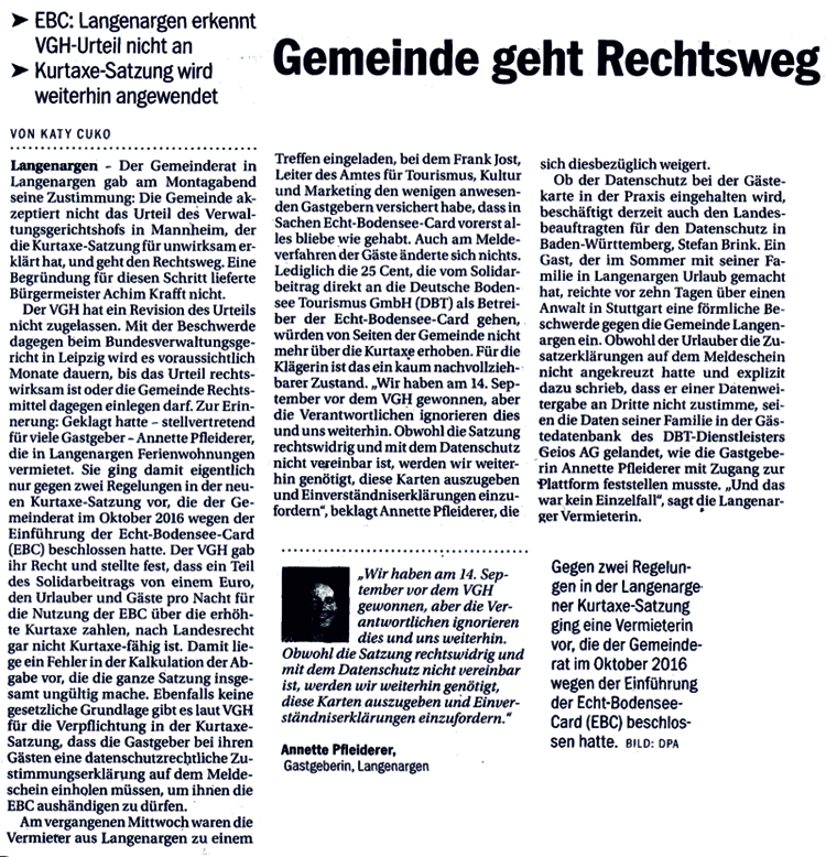 Mit ihrer Entscheidung, sich die Kosten für die Echt-Bodensee-Card vom Gast zurückzuholen, scheinen die Gemeinderäte der Stadt Überlingen das Urteil des Verwaltungsgerichts Mannheim vom 08.01.2018 AZ.: 2S 2439/16 zu ignorieren. Es bedeutet, dass die DBT nicht mit 0,25 Euro aus der Kurtaxe von 1,10 Euro finanziert werden darf und nur die Kosten laut §43 KGA angesetzt werden, welche die Stadt für den Unterhalt ihrer Kur- und Erholungseinrichtungen aufbringt. Somit ist die Stadt genötigt, die Kosten der DBT aus dem Haushalt zu Lasten des Steuerzahlers zu begleichen. Dies widerspricht jeglichem Verständnis eines Solidarbeitrags, bei dem der Steuerzahler keinerlei Vorteile im Zusammenhang mit der EBC Card bzw. der DBT zu erkennen vermag. Es würde den Räten gut zu Gesicht stehen, dies ehrlich zu erklären. Da die Buchführung über die Kameralistik von der Doppik abgelöst wurde, sind die Ausgaben nachvollziehbar. Dem Versteckspiel ist nach dem Motto linke Tasche (Kosten DBT aus dem Haushalt über die Kurtaxe des Gastes) ein Riegel vorgeschoben. Ich selbst war bei der Verhandlung anwesend.