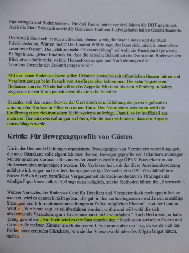 Nach den Erfahrungen der Gastgeber in Langenargen, die Touristenzahlen hört man, sanken in den letzten drei Jahren dort jährlich, sagen die Gastgeber in Uhldingen-Mühlhofen weiterhin laut und deutlich Echt-Bodensee-Card-Nein-Danke und waren bisher erfolgreich mit diesem Wahlspruch. Sie sind es, die an einem optimalen gemeinschaftlichen Miteinander von Vermietern, Gästen und Einwohnern größtes Interesse haben und denen überhöhte Kinderbetreuungs-, Fahrt- oder Lebenshaltungskosten durch Gemeindeabgaben nicht helfen „ihren Laden“ wirtschaftlich vernünftig am Laufen zu halten. Für die Gastgeber ist eine die Gesundheit fördernde, optisch repräsentative, sowie kulturell lebendige Umgebung wesentlich wichtiger, als eine Gästekarte, die Besucher verführt den Ort schnellstmöglich (in den frühen Morgenstunden) zu verlassen und erst spät am Abend zurückzukehren. Nicht Eintagsfliegen sind gewünscht, sondern Mehrtagesgäste, die durch länger dauernden Aufenthalt die Umsatz- und Umweltbilanz verbessern. Die Gastgeber haben durch eine inaktive, wenig produktive oder ideenarme TI eine völlig unnötige Kostenlast zu schultern. Seit Jahren will sich ein weiterer Kostgänger, die DBT als Dachorganisation an den Tisch schleichen, um sich die besten Brocken für „Ineffektivität“ einzuverleiben. Drucksachen oder Internetdienstleistungen werden von der örtlichen TI sowie DBT an Dritte „weitergereicht“, die dann nochmals wieder neue Gebühren verlangen. Dabei verfügen die Gastgeber in der Regel über attraktive Kanäle oder Internetportale um ihre individuelle Botschaft direkt und geistreich an den Gast zu bringen. Der „neue“ Bürgermeister Männle wäre gut beraten den Einwohnern das Vorhaben und die Mehrkosten im Gemeindeblatt vorzustellen und dem Gastgeber Uhldingen-Mühlhofen e.V. einen Raum für die Vermittlung ihrer Vorstellungen zu gewähren. Das Bürgermeister - Blättle leidet derzeit ohnehin unter dem, auch für Inserenten, interessanten fehlenden Inhalt und Umfang. Mit der Wortmeldung der Uhldingen-Mühlhofener Gastgeber möchte ich Sie nachstehend bekannt machen. Deren aktuellste Wortmeldung im Südkurier lautete wie folgt (Abschrift):