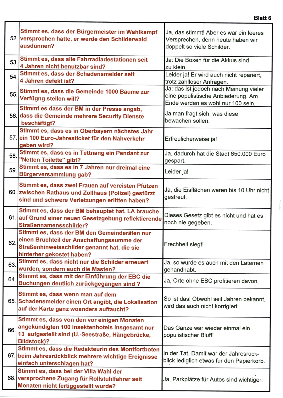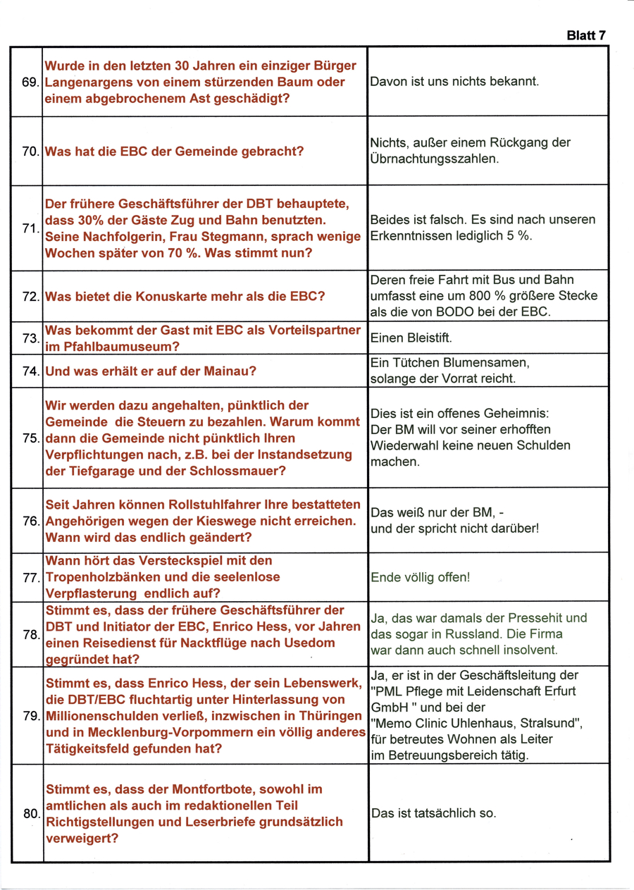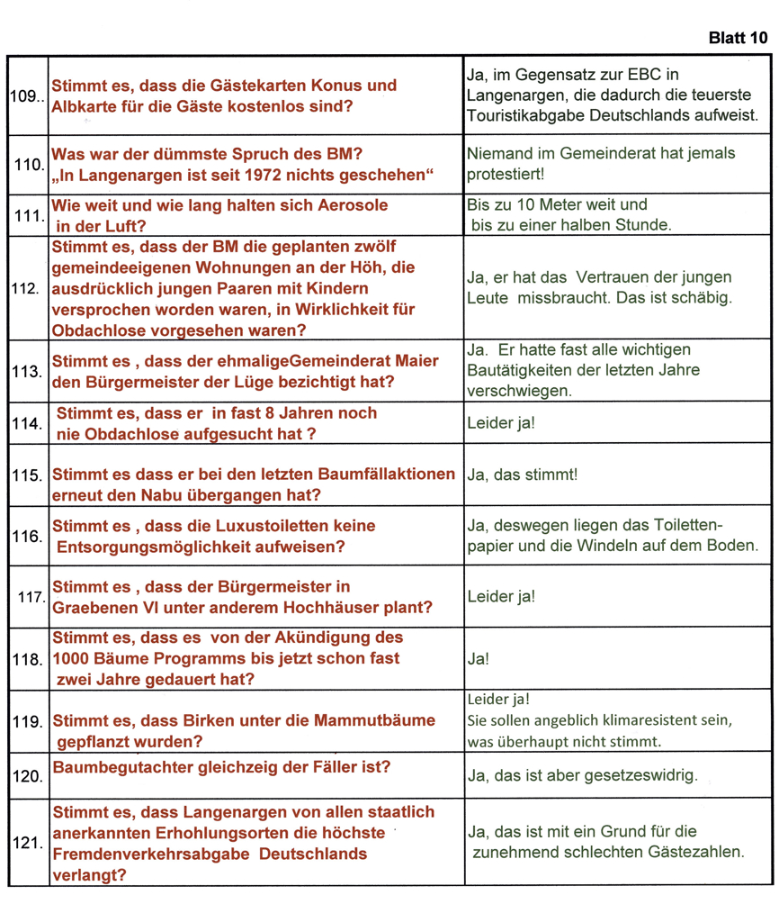 Die Reihenfolge der folgenden Fragen und Antworten veröffentlichen wir so, wie sie uns erreicht haben. Alle 10 Seiten beziehen sich auf die Ära des Herrn Bürgermeisters Krafft.