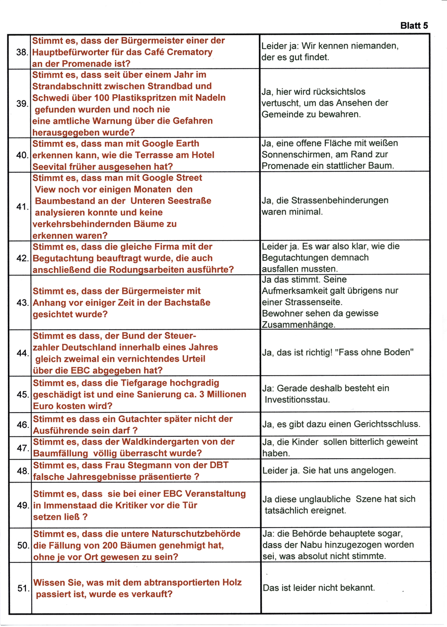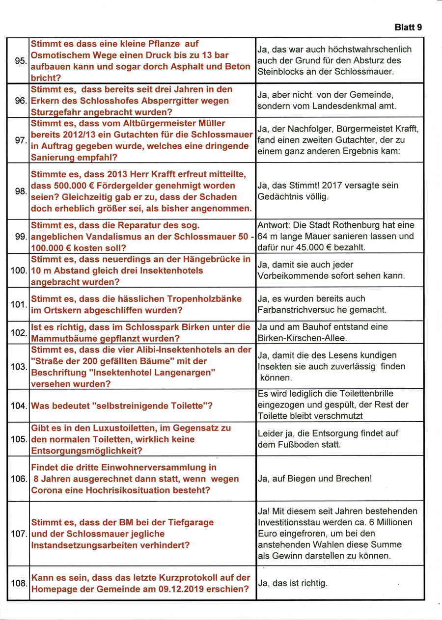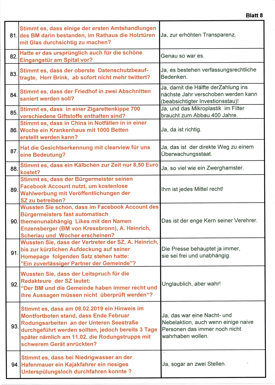 Die Reihenfolge der folgenden Fragen und Antworten veröffentlichen wir so, wie sie uns erreicht haben. Alle 10 Seiten beziehen sich auf die Ära des Herrn Bürgermeisters Krafft.